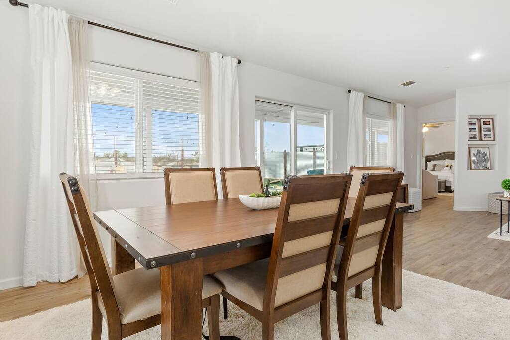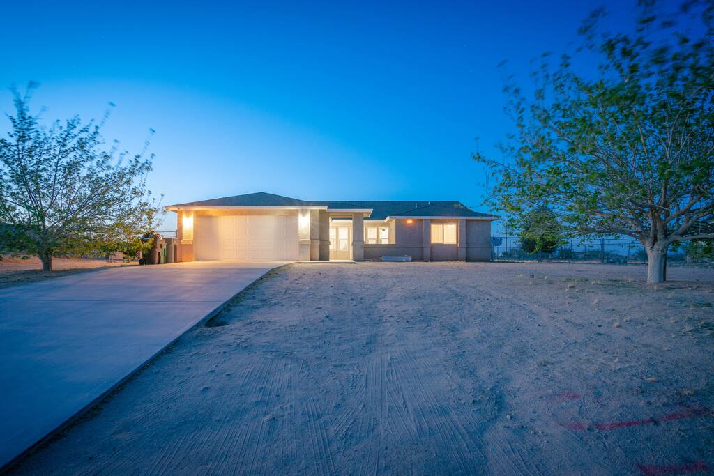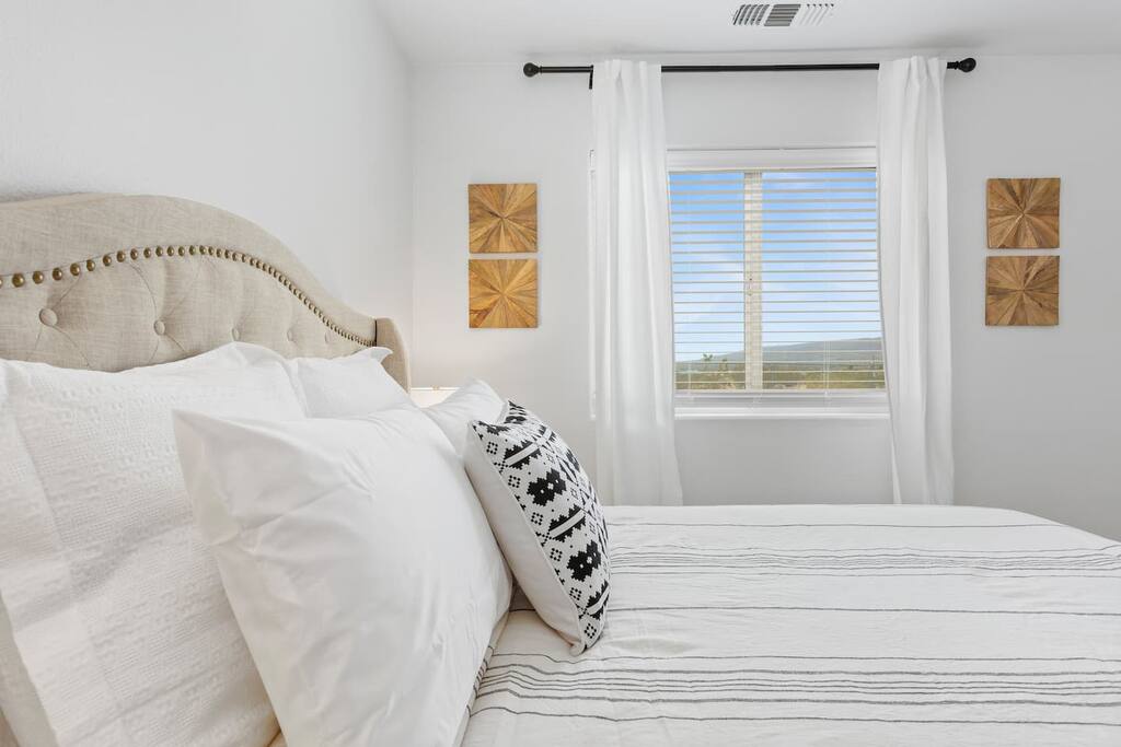 Our bright and airy space mirrors the beauty of the surrounding desert. This 3-bedroom, 2 bath house works well for friends, couples, and families who want to experience all that Joshua Tree has to offer. We can comfortably accommodate up to 10 guests. The spacious living room is large enough to gather everyone to play board games or to relax and watch a movie on our 65’’ smart TV that comes with Disney+, HBO Max, Hulu, and Netflix! We also offer fast and reliable Wi-Fi so you can stay connected. Each bed has a high-quality mattress and brand-new bedding so that you can sleep in coolness and comfort each night. Bedroom 1: Queen Bedroom 2: Queen Bedroom 3: Queen 2 Twin Roller Beds 1 day bed that sleeps 2 The bathrooms come with essentials, including a hairdryer, towels, soap, and shampoo, for your convenience. While downtown Joshua Tree offers fun local restaurants, sometimes nothing beats a relaxing meal at home. Our huge, fully stocked kitchen has everything you need for a fun dinner with the group: Refrigerator Stovetop Dishwasher Microwave Keurig Coffee Maker Pots and pans Cooking utensils Sharp-set of knives Oils and basic spices Toaster Spill something on your favorite shirt or run out of clothes during your stay? We have a washer and dryer on the property to get you clean in no time. ** OUR FAVORITE THINGS TO DO NEARBY ** There's no other place quite like Joshua Tree National Park. Visitors from all over the world come to visit its famous trees and stunning landscapes and hike and climb through its many trails. There are a few different entrances to the Park, but the house is closest to the main one, WEST ENTRANCE, off Hwy 62. This house has an amazing location! Restaurants/Bars: 8 Star Cafe (7.9 Miles) Starbucks (7.0 Miles) Dragon King Buffet (7.1 Miles) Pie for the People (5.2 Miles) Natural Sisters Cafe (1.8 Miles) Yucca Kabob and Hookah (7.5 Miles) Kimi Grill Japanese Restaurant (10.7 Miles) Airports: Yucca Valley Airport (7.5 Miles) Palm Springs International Airport (40.8 Miles) Grocery Stores: Vons (7.3 Miles) Grocery Outlet (7.8 Miles) Stater Bros. Markets (6.6 Miles) Activities: Joshua Tree National Park (6.8 Miles) Hi-Desert Nature Museum (7.9 Miles) Desert Christ Park (9.3 Miles) Brehm Park Family Recreation Center (8.8 Miles) Yucca Valley BMX (8.4 Miles) Essig Park (8.9 Miles) Yucca Bowl (6.4 Miles)