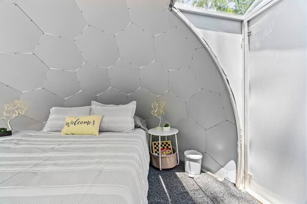 - Dome which includes a memory foam mattress bed with cooling pillows - A separate outhouse with toilet & hand washing station.