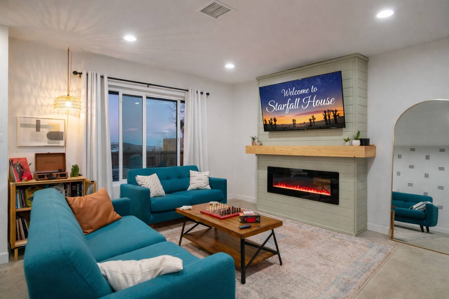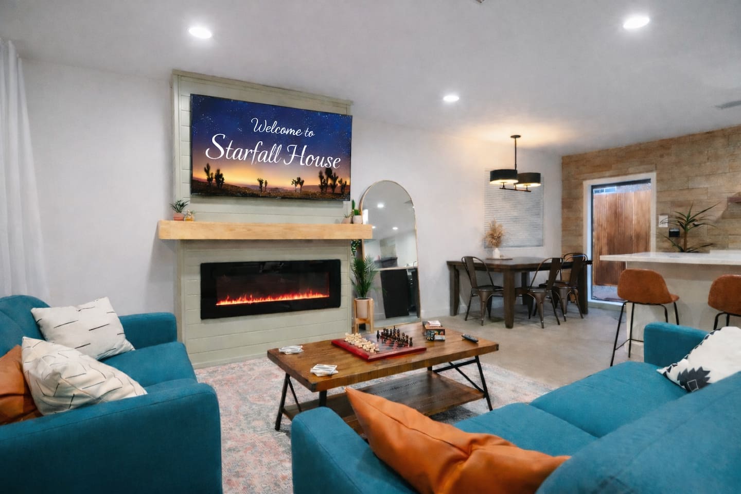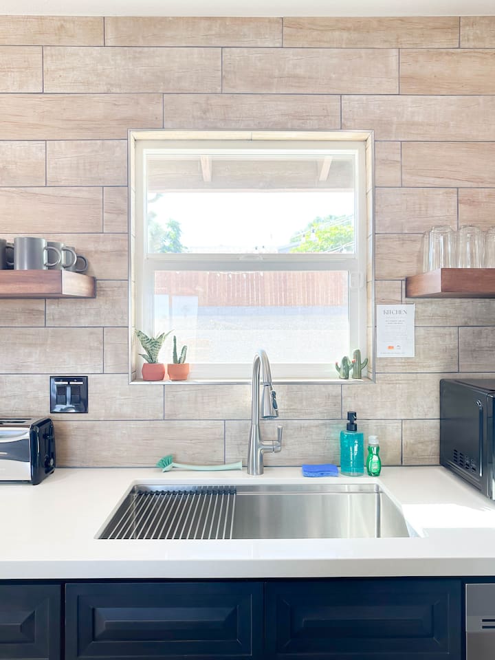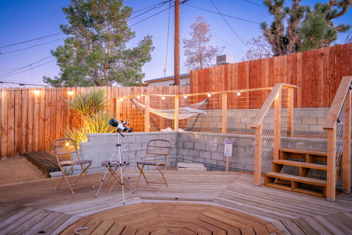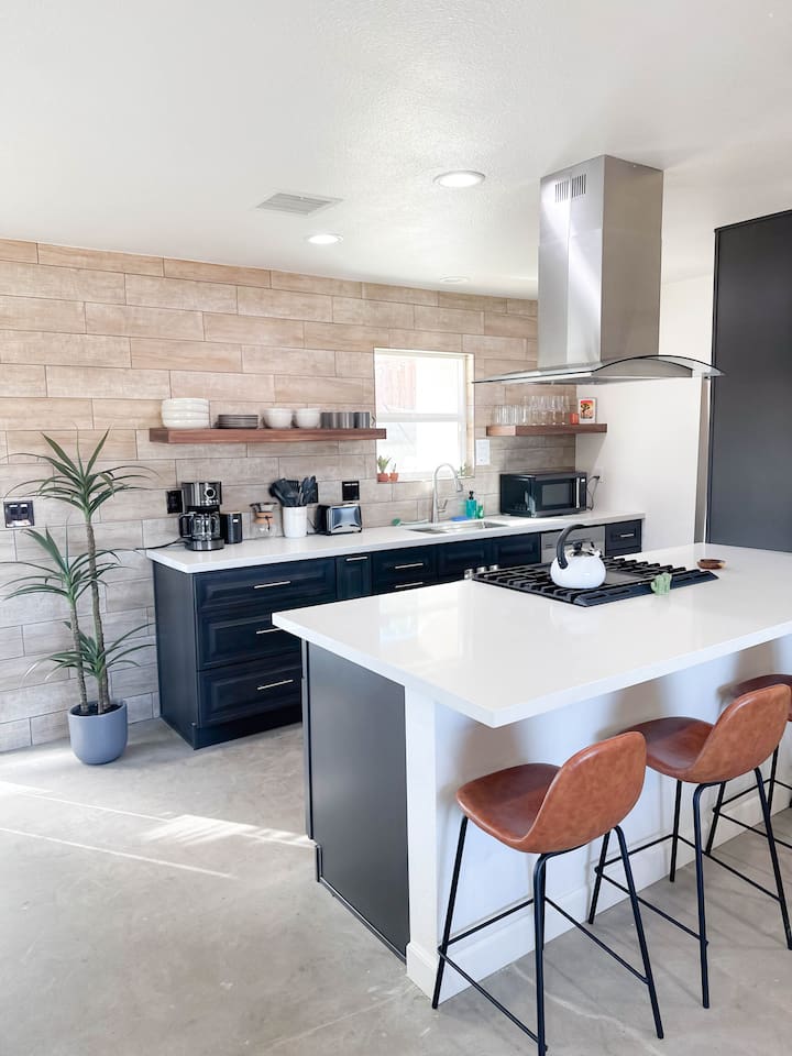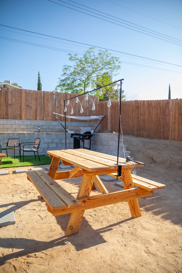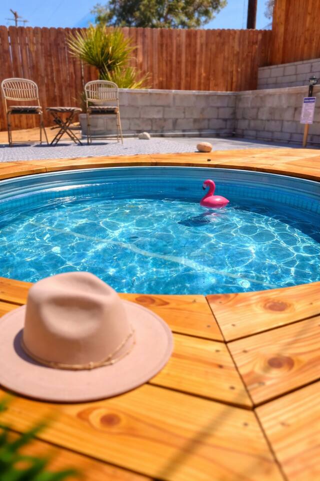 **Please note that the Cowboy Pool is only filled and available for use during the warmer summer months. It will be closed from October through April and will reopen on April 1st.** ☼ Home Highlights • Beautiful Backyard Oasis • Located in a quiet and safe suburban neighborhood • Hand-crafted colorful accent walls in each bedroom ♡ • Hand-painted accent walls in the living room & bathroom ♡ • Air Conditioning/heating/ceiling fans • Enjoy the perfect ambience of our electric fireplace in the living room ☼LIVING ROOM☼ Relax on the couch with a cozy movie night on our Smart 55" TV, and turn on the electric fireplace to create the perfect ambiance. Multiple streaming services are available on the smart TV including Netflix, Hulu & Disney+, but you will need to provide your own login. Play some tunes on the Victrola record player, while you gather around and indulge in some friendly competition playing UNO and other games. In the record player cabinet you'll find a selection of records, books, and games for all ages to enjoy during your stay. ☼KITCHEN & DINING☼ The fully equipped kitchen has everything you should need to make tasty meals for the group. Featuring a stainless steel gas range, refrigerator & dishwasher. For your convenience, the refrigerator provides filtered water for drinking. Our floating shelves are fully stocked with plates, bowls, mugs, cups and wine glasses. While the cabinets are stocked with all basic kitchen essentials like pots, pans, utensils, and essentail spices and oils. We also have a toaster and microwave. Watch the sunrise with a cup of Jo, we supply organic coffee for the Keurig coffee machine. Tea and hot cocoa are also available. Inside, enjoy meals together at the dining table with a seating of 4, or you can opt for al fresco dining under the desert sky at the picnic table. We added moody ambient string lighting to the picnic table for you to enjoy. ☼BED & BATH☼ Starfall House comfortably sleeps up to 4 guests, making it ideal for couples, or small groups. Both bedrooms offer a comfy night's sleep on a queen size bed. If you should ever get chilly, extra blankets and pillows can be found in the bedroom closets. We also provide a luggage carrier in each room for your convenience and plenty of closet space. Each room features a thoughtfully curated hand-made accent wall, perfect for photos. The “terracotta” bedroom features a unique wall design that instantly puts you in a great mood. There are gold touches throughout the room, the hanging lamps and circle gold mirror. Another thing that makes the terracotta room so special is the amazing backyard view you get right from your window! The "sage green" bedroom has a calm and relaxing feel. It features a dedicated workspace where you can comfortably get any work done. There is an arch mirror so you can get ready for the day and our bedside lamps feature USB ports to charge your phone. Play some tunes on the retro Victrola bluetooth speaker. The home has one full size bathroom, featuring a fun & quirky hand-painted accent wall. We provide complimentary shampoo, conditioner & body wash that you will find in the shower. A hair dryer & a first aid kit can also be found in the bathroom vanity. ☼OUTDOORS☼ Stargaze & recharge in our dreamy backyard oasis. Take a dip in our cowboy pool on a warm desert day. (built inside an awesome octagon-shaped deck!) A great place to capture Joshua Tree memories! We welcome you to curl up in our cozy hammock (one of our personal favorites places to unwind ♡) the perfect spot to read your favorite book or enjoy an afternoon nap. Feeling hungry? Fire up the BBQ for all your grilling and chilling needs. Dinner under the stars? We offer a picnic table with ambient string lighting for guests to enjoy a moody “dinner under the stars” moment. Count the shooting stars while getting warm & toasty around the fire pit. Be amazed as you count craters in the moon with our telescope. Our motto here at The Starfall House is Good company. Good vibes. Good spirits. **Please note that the Cowboy Pool is only filled and available for use during the warmer summer months. It will be closed from October through April and will reopen on April 1st.** Amenities we offer outside: ✦ Front yard • Fire Pit in private front yard • Peaking views of the desert mountains • Ambient string lighting • Chairs with built-in cup holders ✦ Backyard • Cowboy Pool (8ft) with Large Octagon Deck surrounding it • BBQ • Outside seating areas • Picnic table • Hammock • Corn hole • Ambient string lighting **Please note that the Cowboy Pool is only filled and available for use during the warmer summer months. It will be closed from October through April and will reopen on April 1st.** Whether you’re watching the starry night skies from our octagon-shaped deck or relaxing next to the fire pit, you’ll love escaping here in our high desert paradise. A place where you can revitalize your spirits and connect with nature. Our home is a peaceful & relaxing retreat. We put a lot of time, care and love into it, creating fun and colorful moments around the home.♡ You’ll find lots of special design touches throughout the house as they were thoughtfully hand-crafted with love. Other details to note: Please note: • No parties are allowed. Evidence of a party will result in immediate cancellation of yourreservation and a fine will be given. • No smoking is allowed in the interior of the property. However, smoking is allowed in the fenced in area of the front yard of the property. Any evidence of smoking in the house will result in additional fees being applied. • The person that made the reservation needs to be present at the property for the duration ofthe reservation. • Please be mindful of the neighborhood and our neighbors. We ask you that you keep noiselevels down and keep quiet hours from 9pm-8am. Please note there are cameras around the property for your