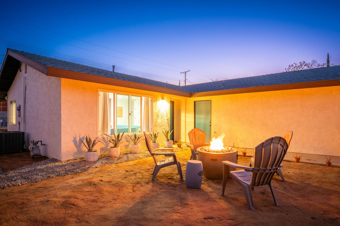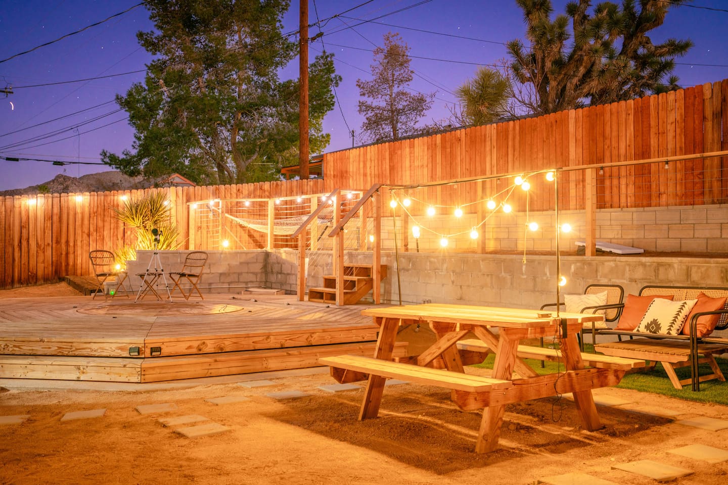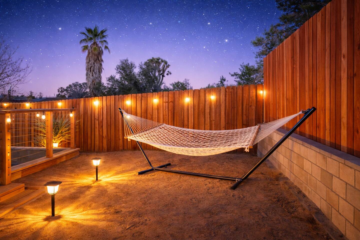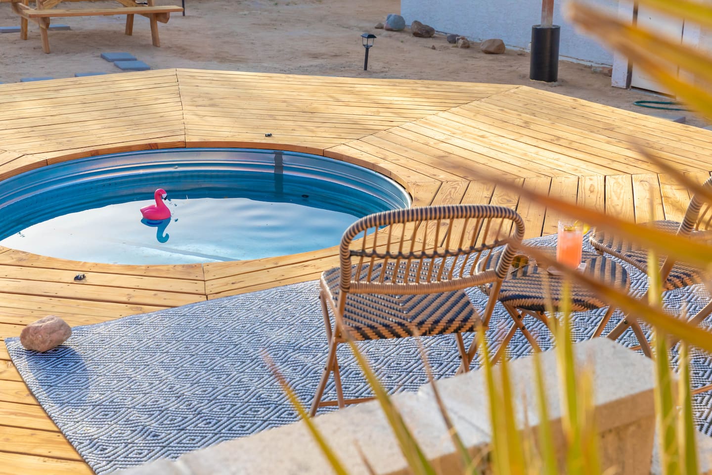 **Please note that the Cowboy Pool is only filled and available for use during the warmer summer months. It will be closed from October through April and will reopen on April 1st.** ☼ Home Highlights • Beautiful Backyard Oasis • Located in a quiet and safe suburban neighborhood • Hand-crafted colorful accent walls in each bedroom ♡ • Hand-painted accent walls in the living room & bathroom ♡ • Air Conditioning/heating/ceiling fans • Enjoy the perfect ambience of our electric fireplace in the living room ☼LIVING ROOM☼ Relax on the couch with a cozy movie night on our Smart 55" TV, and turn on the electric fireplace to create the perfect ambiance. Multiple streaming services are available on the smart TV including Netflix, Hulu & Disney+, but you will need to provide your own login. Play some tunes on the Victrola record player, while you gather around and indulge in some friendly competition playing UNO and other games. In the record player cabinet you'll find a selection of records, books, and games for all ages to enjoy during your stay. ☼KITCHEN & DINING☼ The fully equipped kitchen has everything you should need to make tasty meals for the group. Featuring a stainless steel gas range, refrigerator & dishwasher. For your convenience, the refrigerator provides filtered water for drinking. Our floating shelves are fully stocked with plates, bowls, mugs, cups and wine glasses. While the cabinets are stocked with all basic kitchen essentials like pots, pans, utensils, and essentail spices and oils. We also have a toaster and microwave. Watch the sunrise with a cup of Jo, we supply organic coffee for the Keurig coffee machine. Tea and hot cocoa are also available. Inside, enjoy meals together at the dining table with a seating of 4, or you can opt for al fresco dining under the desert sky at the picnic table. We added moody ambient string lighting to the picnic table for you to enjoy. ☼BED & BATH☼ Starfall House comfortably sleeps up to 4 guests, making it ideal for couples, or small groups. Both bedrooms offer a comfy night's sleep on a queen size bed. If you should ever get chilly, extra blankets and pillows can be found in the bedroom closets. We also provide a luggage carrier in each room for your convenience and plenty of closet space. Each room features a thoughtfully curated hand-made accent wall, perfect for photos. The “terracotta” bedroom features a unique wall design that instantly puts you in a great mood. There are gold touches throughout the room, the hanging lamps and circle gold mirror. Another thing that makes the terracotta room so special is the amazing backyard view you get right from your window! The "sage green" bedroom has a calm and relaxing feel. It features a dedicated workspace where you can comfortably get any work done. There is an arch mirror so you can get ready for the day and our bedside lamps feature USB ports to charge your phone. Play some tunes on the retro Victrola bluetooth speaker. The home has one full size bathroom, featuring a fun & quirky hand-painted accent wall. We provide complimentary shampoo, conditioner & body wash that you will find in the shower. A hair dryer & a first aid kit can also be found in the bathroom vanity. ☼OUTDOORS☼ Stargaze & recharge in our dreamy backyard oasis. Take a dip in our cowboy pool on a warm desert day. (built inside an awesome octagon-shaped deck!) A great place to capture Joshua Tree memories! We welcome you to curl up in our cozy hammock (one of our personal favorites places to unwind ♡) the perfect spot to read your favorite book or enjoy an afternoon nap. Feeling hungry? Fire up the BBQ for all your grilling and chilling needs. Dinner under the stars? We offer a picnic table with ambient string lighting for guests to enjoy a moody “dinner under the stars” moment. Count the shooting stars while getting warm & toasty around the fire pit. Be amazed as you count craters in the moon with our telescope. Our motto here at The Starfall House is Good company. Good vibes. Good spirits. **Please note that the Cowboy Pool is only filled and available for use during the warmer summer months. It will be closed from October through April and will reopen on April 1st.** Amenities we offer outside: ✦ Front yard • Fire Pit in private front yard • Peaking views of the desert mountains • Ambient string lighting • Chairs with built-in cup holders ✦ Backyard • Cowboy Pool (8ft) with Large Octagon Deck surrounding it • BBQ • Outside seating areas • Picnic table • Hammock • Corn hole • Ambient string lighting **Please note that the Cowboy Pool is only filled and available for use during the warmer summer months. It will be closed from October through April and will reopen on April 1st.** Whether you’re watching the starry night skies from our octagon-shaped deck or relaxing next to the fire pit, you’ll love escaping here in our high desert paradise. A place where you can revitalize your spirits and connect with nature. Our home is a peaceful & relaxing retreat. We put a lot of time, care and love into it, creating fun and colorful moments around the home.♡ You’ll find lots of special design touches throughout the house as they were thoughtfully hand-crafted with love. Other details to note: Please note: • No parties are allowed. Evidence of a party will result in immediate cancellation of yourreservation and a fine will be given. • No smoking is allowed in the interior of the property. However, smoking is allowed in the fenced in area of the front yard of the property. Any evidence of smoking in the house will result in additional fees being applied. • The person that made the reservation needs to be present at the property for the duration ofthe reservation. • Please be mindful of the neighborhood and our neighbors. We ask you that you keep noiselevels down and keep quiet hours from 9pm-8am. Please note there are cameras around the property for your