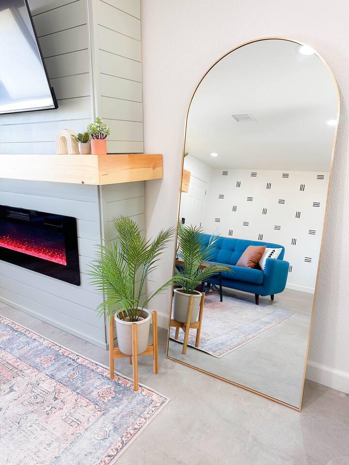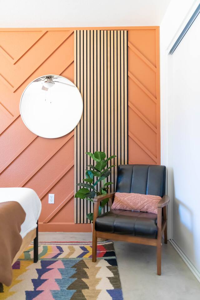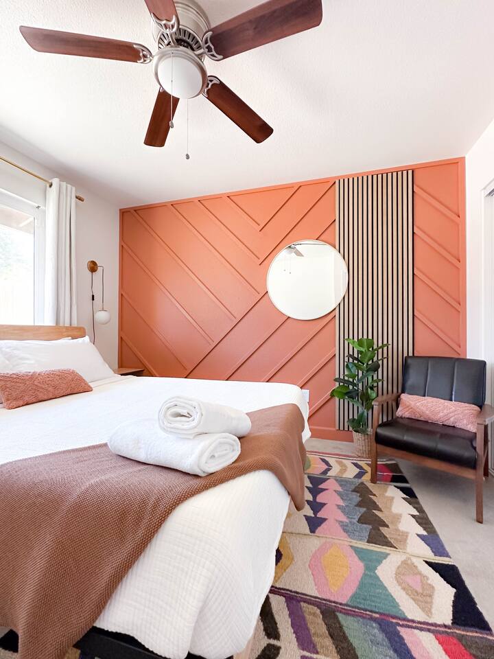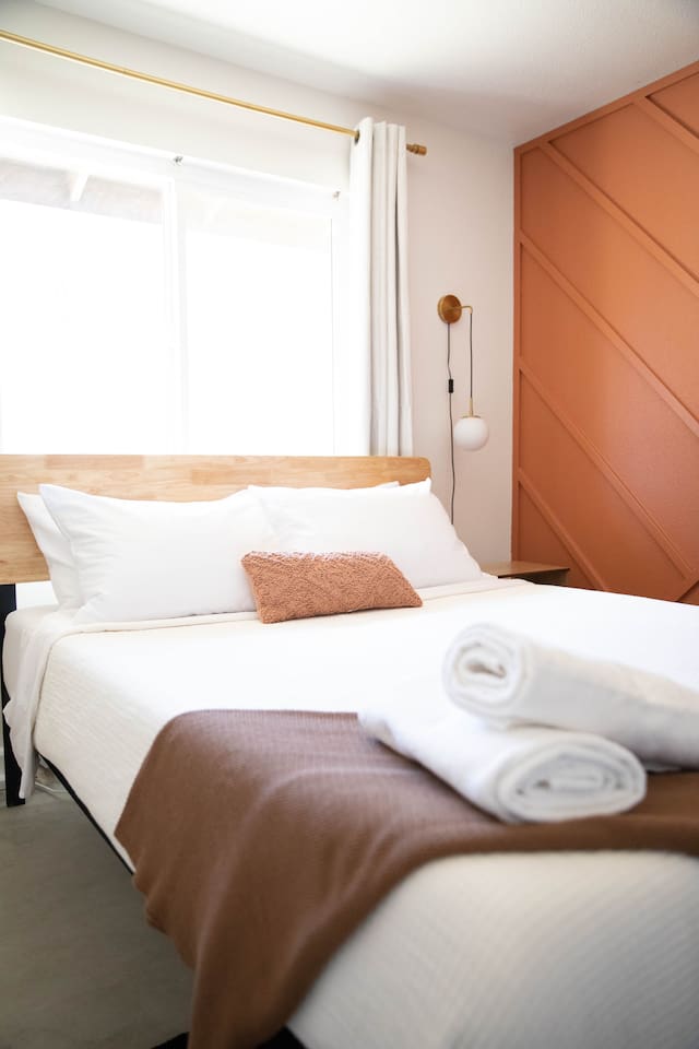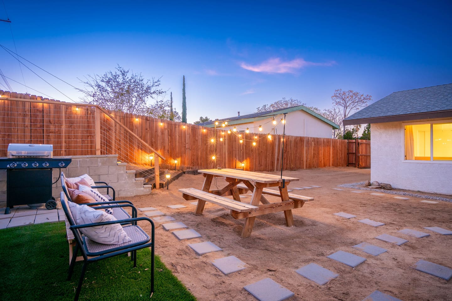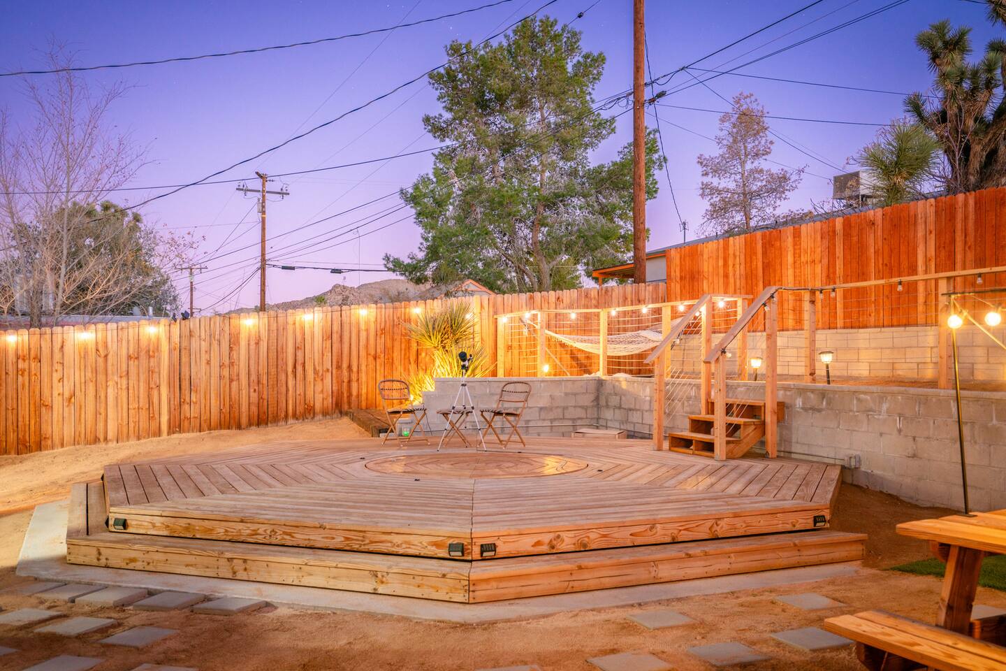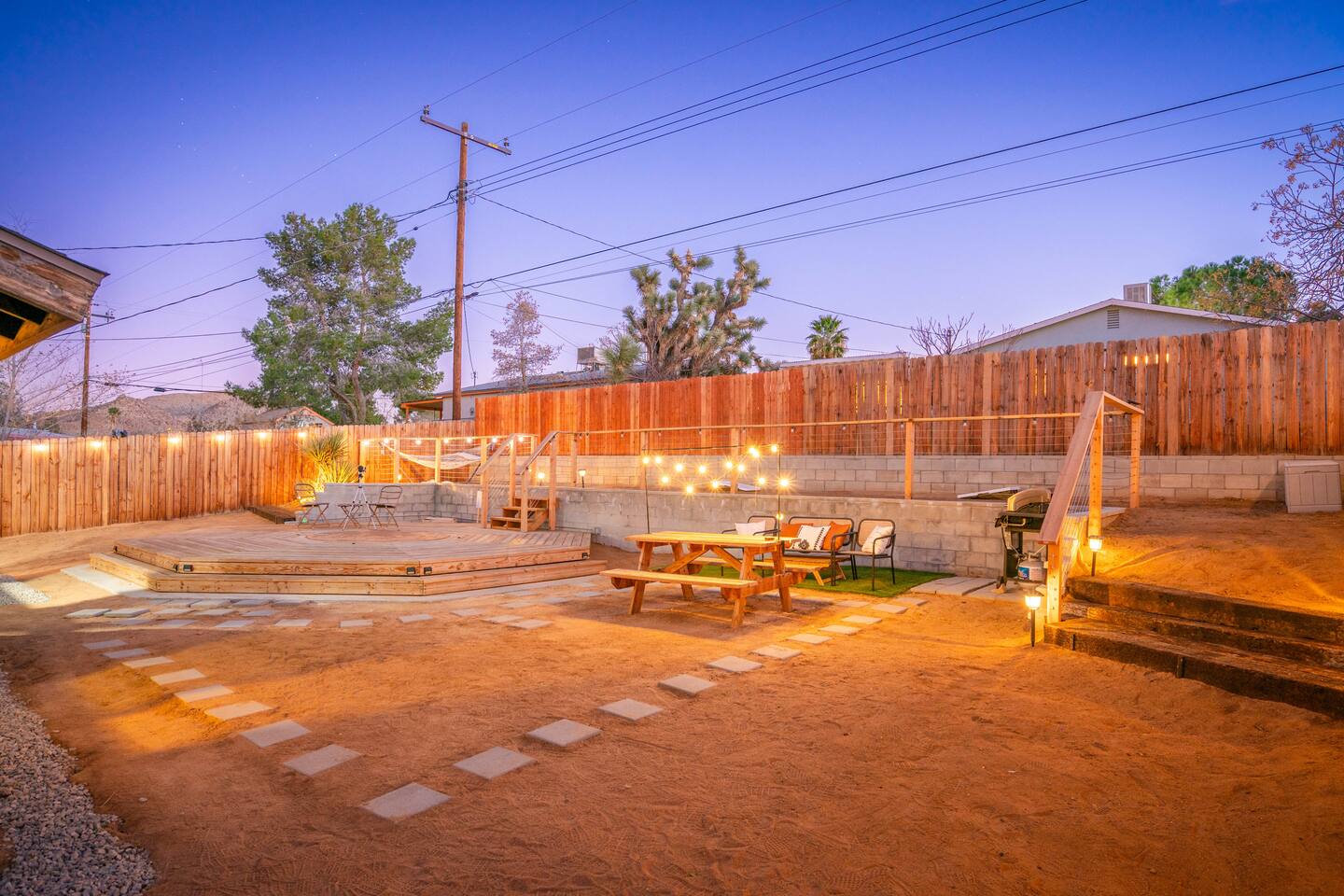 **Please note that the Cowboy Pool is only filled and available for use during the warmer summer months. It will be closed from October through April and will reopen on April 1st.** ☼ Home Highlights • Beautiful Backyard Oasis • Located in a quiet and safe suburban neighborhood • Hand-crafted colorful accent walls in each bedroom ♡ • Hand-painted accent walls in the living room & bathroom ♡ • Air Conditioning/heating/ceiling fans • Enjoy the perfect ambience of our electric fireplace in the living room ☼LIVING ROOM☼ Relax on the couch with a cozy movie night on our Smart 55" TV, and turn on the electric fireplace to create the perfect ambiance. Multiple streaming services are available on the smart TV including Netflix, Hulu & Disney+, but you will need to provide your own login. Play some tunes on the Victrola record player, while you gather around and indulge in some friendly competition playing UNO and other games. In the record player cabinet you'll find a selection of records, books, and games for all ages to enjoy during your stay. ☼KITCHEN & DINING☼ The fully equipped kitchen has everything you should need to make tasty meals for the group. Featuring a stainless steel gas range, refrigerator & dishwasher. For your convenience, the refrigerator provides filtered water for drinking. Our floating shelves are fully stocked with plates, bowls, mugs, cups and wine glasses. While the cabinets are stocked with all basic kitchen essentials like pots, pans, utensils, and essentail spices and oils. We also have a toaster and microwave. Watch the sunrise with a cup of Jo, we supply organic coffee for the Keurig coffee machine. Tea and hot cocoa are also available. Inside, enjoy meals together at the dining table with a seating of 4, or you can opt for al fresco dining under the desert sky at the picnic table. We added moody ambient string lighting to the picnic table for you to enjoy. ☼BED & BATH☼ Starfall House comfortably sleeps up to 4 guests, making it ideal for couples, or small groups. Both bedrooms offer a comfy night's sleep on a queen size bed. If you should ever get chilly, extra blankets and pillows can be found in the bedroom closets. We also provide a luggage carrier in each room for your convenience and plenty of closet space. Each room features a thoughtfully curated hand-made accent wall, perfect for photos. The “terracotta” bedroom features a unique wall design that instantly puts you in a great mood. There are gold touches throughout the room, the hanging lamps and circle gold mirror. Another thing that makes the terracotta room so special is the amazing backyard view you get right from your window! The "sage green" bedroom has a calm and relaxing feel. It features a dedicated workspace where you can comfortably get any work done. There is an arch mirror so you can get ready for the day and our bedside lamps feature USB ports to charge your phone. Play some tunes on the retro Victrola bluetooth speaker. The home has one full size bathroom, featuring a fun & quirky hand-painted accent wall. We provide complimentary shampoo, conditioner & body wash that you will find in the shower. A hair dryer & a first aid kit can also be found in the bathroom vanity. ☼OUTDOORS☼ Stargaze & recharge in our dreamy backyard oasis. Take a dip in our cowboy pool on a warm desert day. (built inside an awesome octagon-shaped deck!) A great place to capture Joshua Tree memories! We welcome you to curl up in our cozy hammock (one of our personal favorites places to unwind ♡) the perfect spot to read your favorite book or enjoy an afternoon nap. Feeling hungry? Fire up the BBQ for all your grilling and chilling needs. Dinner under the stars? We offer a picnic table with ambient string lighting for guests to enjoy a moody “dinner under the stars” moment. Count the shooting stars while getting warm & toasty around the fire pit. Be amazed as you count craters in the moon with our telescope. Our motto here at The Starfall House is Good company. Good vibes. Good spirits. **Please note that the Cowboy Pool is only filled and available for use during the warmer summer months. It will be closed from October through April and will reopen on April 1st.** Amenities we offer outside: ✦ Front yard • Fire Pit in private front yard • Peaking views of the desert mountains • Ambient string lighting • Chairs with built-in cup holders ✦ Backyard • Cowboy Pool (8ft) with Large Octagon Deck surrounding it • BBQ • Outside seating areas • Picnic table • Hammock • Corn hole • Ambient string lighting **Please note that the Cowboy Pool is only filled and available for use during the warmer summer months. It will be closed from October through April and will reopen on April 1st.** Whether you’re watching the starry night skies from our octagon-shaped deck or relaxing next to the fire pit, you’ll love escaping here in our high desert paradise. A place where you can revitalize your spirits and connect with nature. Our home is a peaceful & relaxing retreat. We put a lot of time, care and love into it, creating fun and colorful moments around the home.♡ You’ll find lots of special design touches throughout the house as they were thoughtfully hand-crafted with love. Other details to note: Please note: • No parties are allowed. Evidence of a party will result in immediate cancellation of yourreservation and a fine will be given. • No smoking is allowed in the interior of the property. However, smoking is allowed in the fenced in area of the front yard of the property. Any evidence of smoking in the house will result in additional fees being applied. • The person that made the reservation needs to be present at the property for the duration ofthe reservation. • Please be mindful of the neighborhood and our neighbors. We ask you that you keep noiselevels down and keep quiet hours from 9pm-8am. Please note there are cameras around the property for your